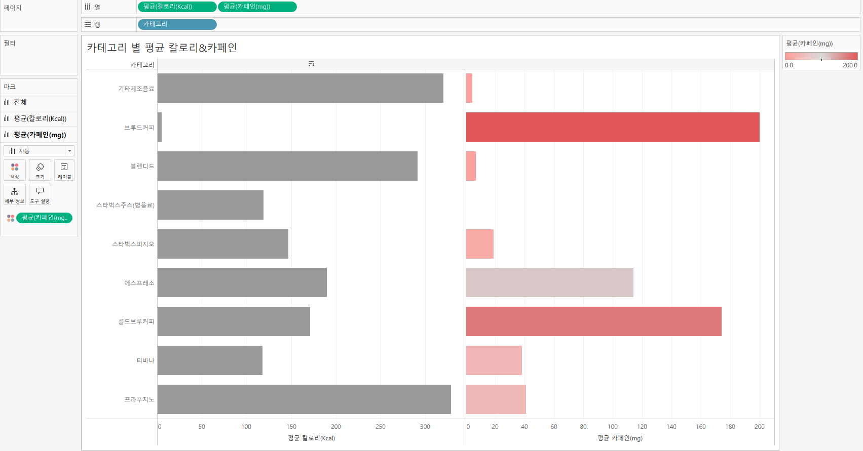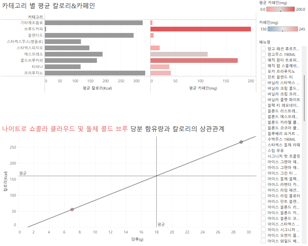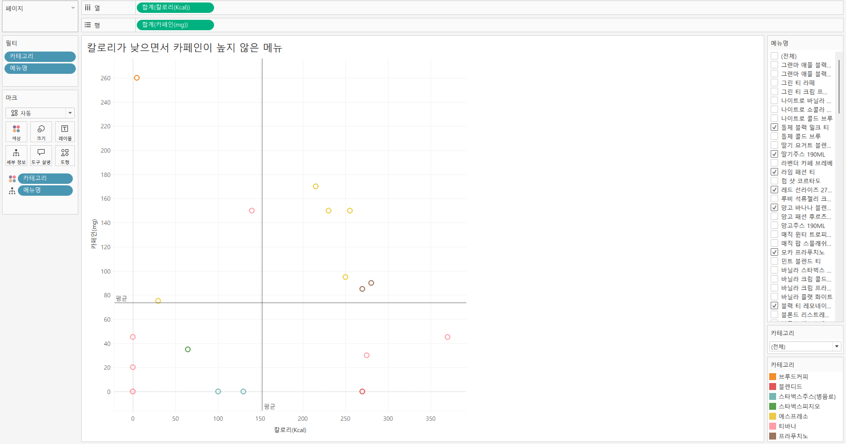 2. 2번 과제에서 메뉴별로 칼로리,카페인으로 보니까